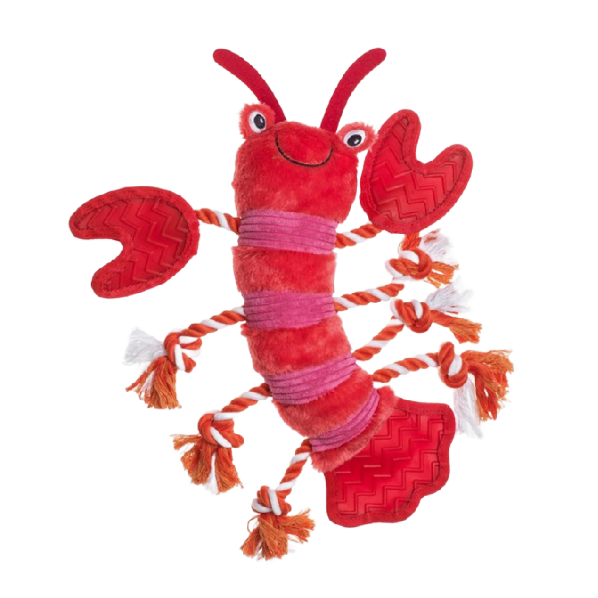 House of Paws Under the Sea range. A colourful lobster plush dog toy featuring lots of lovely textures from plush, rope and TPR to keep your dog amused. Also contains plastic squeaker.