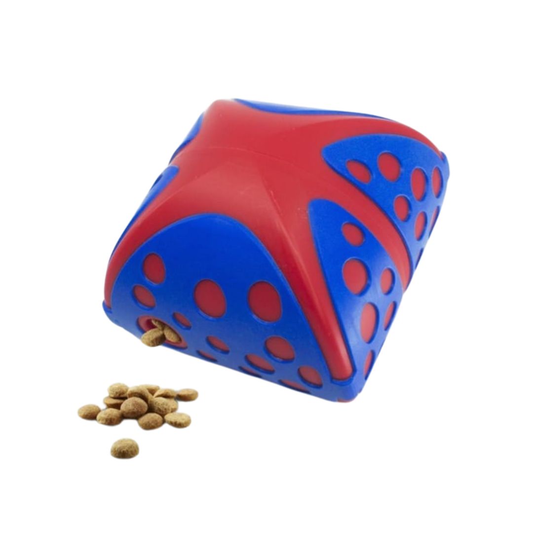KONG Rewards Wally produces a slow and steady roll when nudged, gradually dispensing kibble or treats. The unique exterior creates an unpredictable motion, rewarding natural foraging instincts. The outer grippy material mutes noise for quieter play. Use this 1-cup slow feeder as a food bowl to help manage weight by extending mealtime. Unscrews easily for filling and hand washing.