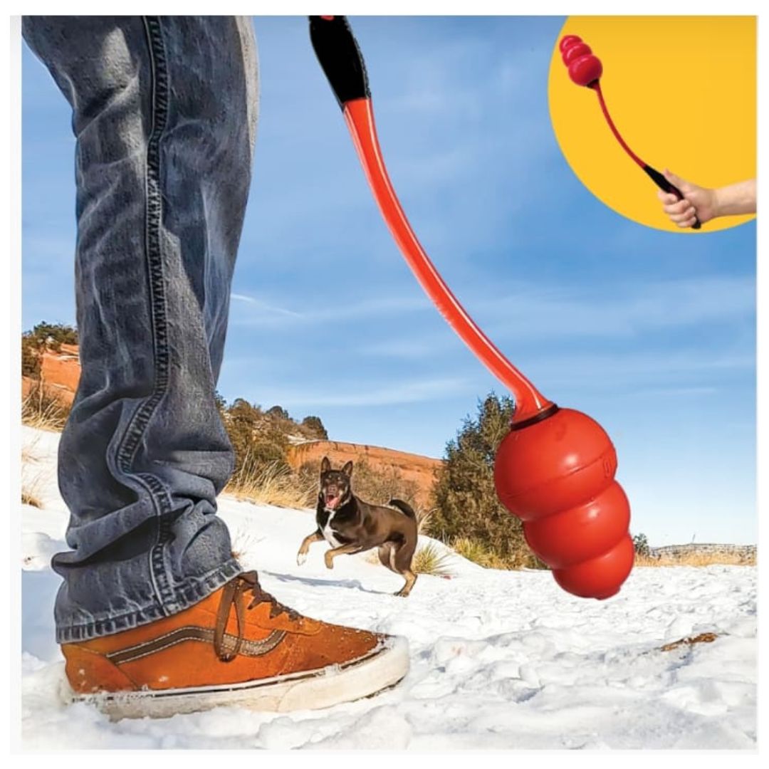 KONG Signature Throw’s special shape scoops and holds medium and large KONG Classics for easy, long-distance fetching for lots of healthy, instinct-satisfying exercise. Years before they were ever stuffed with treats, KONG delighted dogs purely with their dynamic bounce and irresistibly erratic rebound action. Durable construction, padded grip, textured KONG Kupper and ergonomic shape make hands-free pickup a breeze for long-lasting fetching fun.
