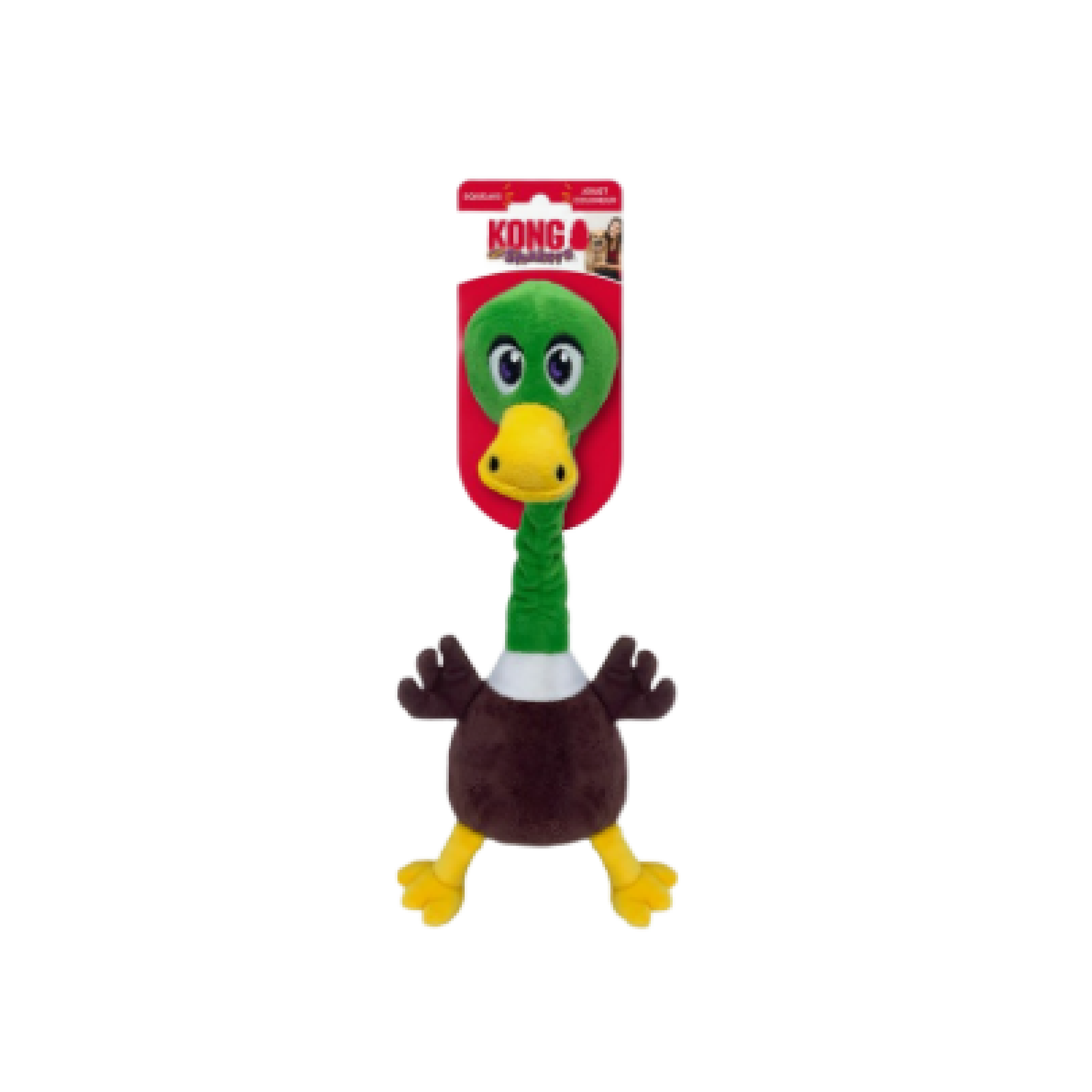 KONG Shakers Bobz Mallard has a tough, flexible cord in his wobbly neck that lets him nod an invitation to thrash his long, floppy body in instinct-satisfying bouts of duck-duck-shake. The low-toned squeaker prolongs playtime while a layer of reinforcement extends the shaking, fetching and flinging fun.